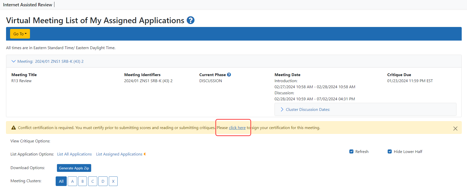 NOTE: When accessing the Virtual Meeting Discussion Dashboard directly from the URL for the meeting, a check is performed to ensure COI certification. If you have not completed the COI certification,