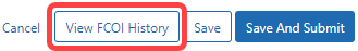 The FCOI History screen is accessible by selecting the link in the Status column of the FCOI Search results or by selecting the View FCOI History button found on the Financial Conflict of Interest – Initiate New Report and FCOI – Revision screens.