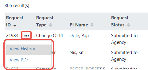 2. In the search results, Closedclick the three-dot ellipsis icon for a request and select View History.