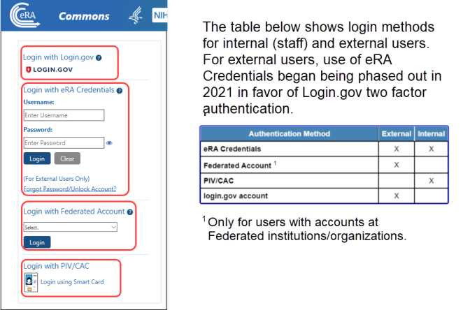 This method uses a username and password that is assigned and maintained by the eRA Commons system. This method is being phased out gradually and eventually all external users must create and associate a two-factor authentication account (Federated account or Login.gov) with their eRA account. Authentication will be accomplished with the two-factor authentication account, after which the user will be logged into the eRA account that was associated with the two-factor account. See below for instructions.