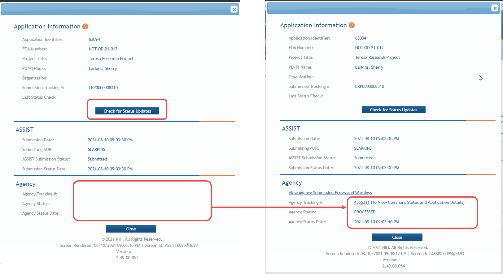 In the Application Information popup, shown below, you can click the Check for Status Updates button. When available, certain Agency tracking information becomes available. "Agency" refers to the federal agency who is processing your award.