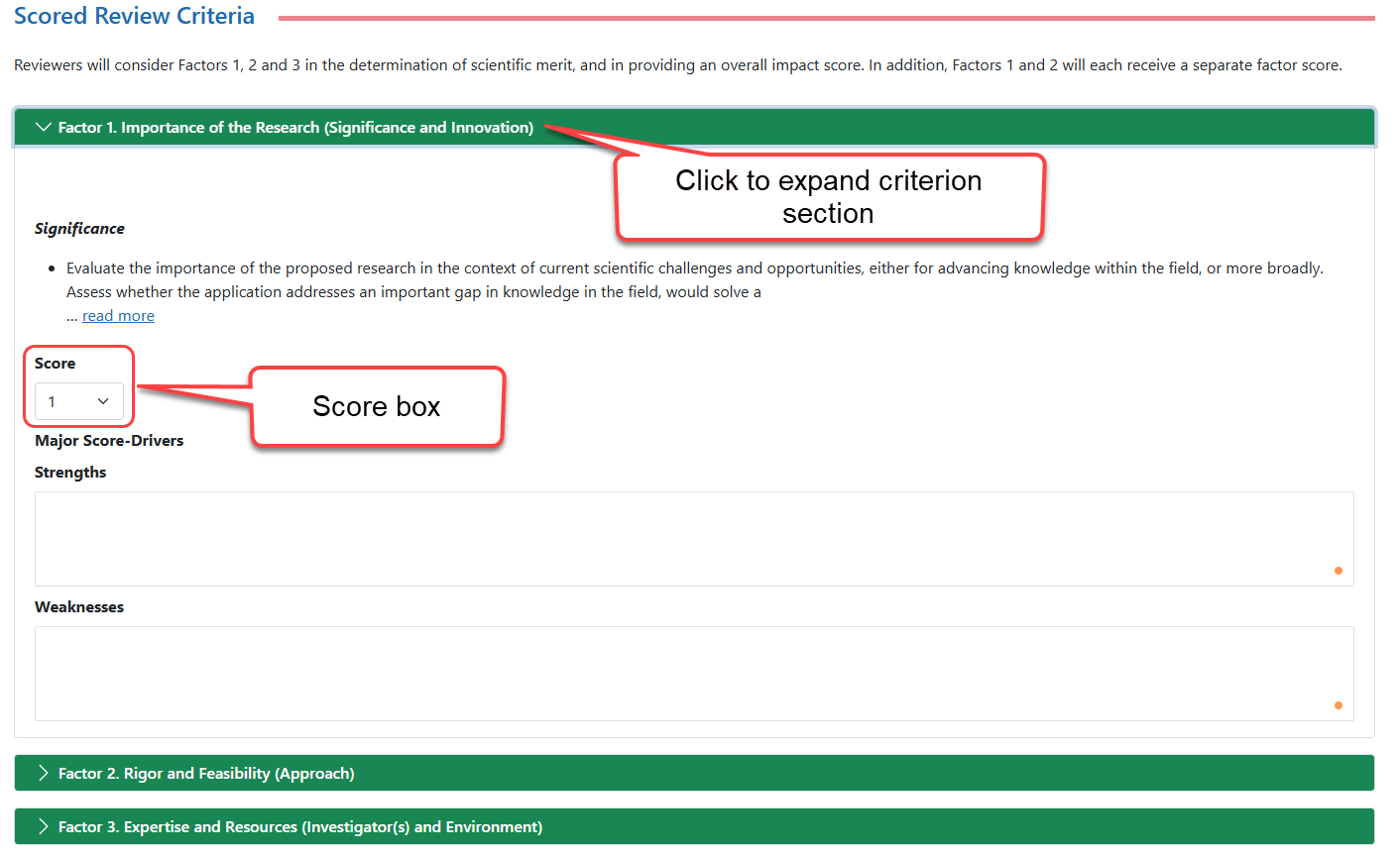 Some templates show the criterion/factor Closedscore boxes outside of each criterion expandable section.