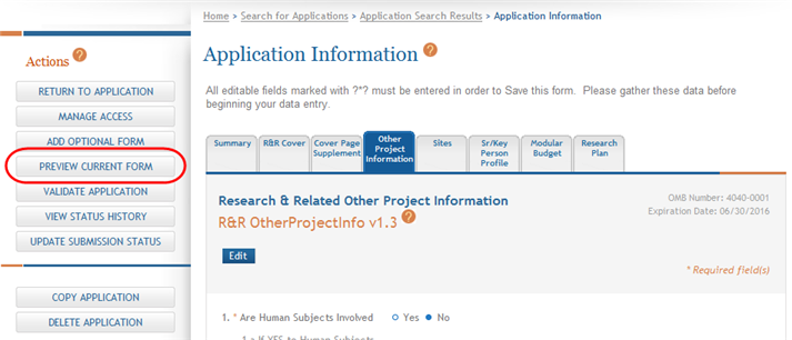 While working on a form of an application, you can open a preview of what that form looks like as a PDF document.