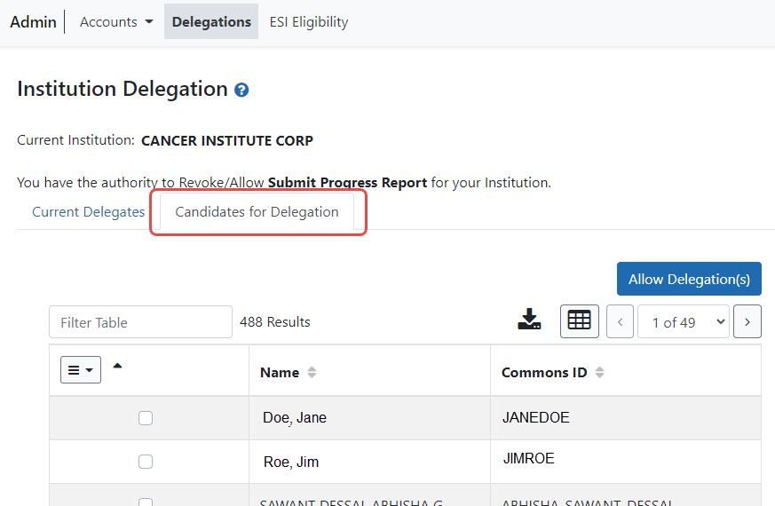 You are returned to the Institution Delegation screen and a Success message appears in green font at the top of the screen. eRA Commons bestows the Submit Progress Report authority for the selected users, who receive an email informing them of the change. The Institution Delegations screen displays the new delegates in the Current Delegates tab. These names no longer appear in the Candidates for Delegation tab.