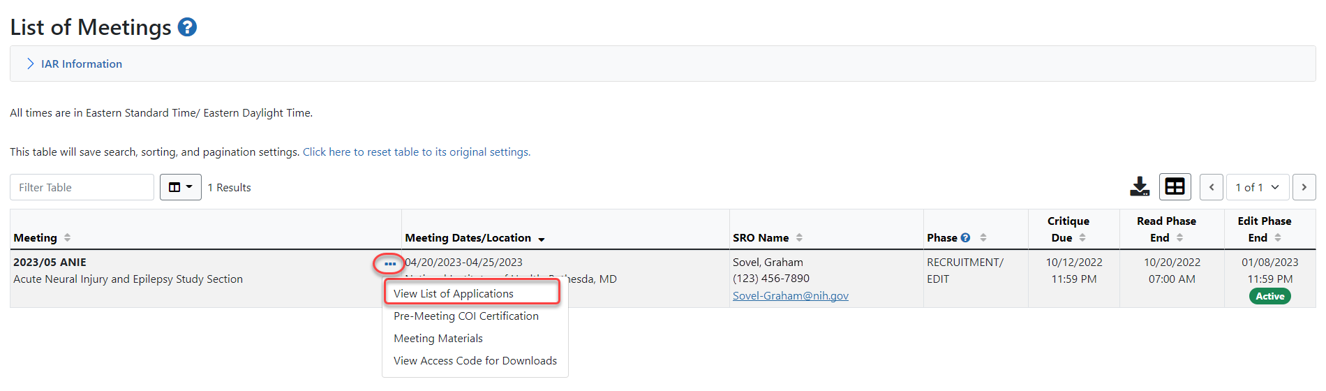 3. The List of Meetings screen displays. If accessible, the View List of Applications link is displayed by clicking on the three-dot ellipses icon. ClosedClick the View List of Applications link.