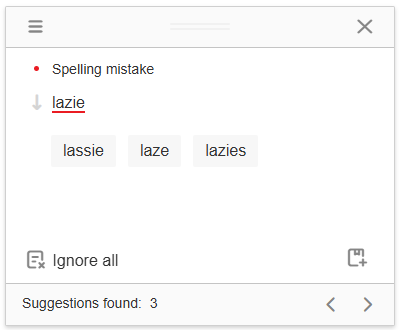 Proofread in dialog – opens a dialog box in a separate window. The window shows the current issue and possible suggestions. At the bottom of the window, the number of suggestions is shown and navigation buttons let you scroll to other issues/suggestions. -
