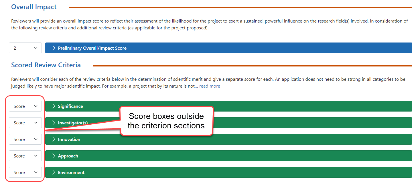 As funding opportunities expire and new opportunities are published, the older templates (score boxes outside the criterion sections) will eventually not be seen.