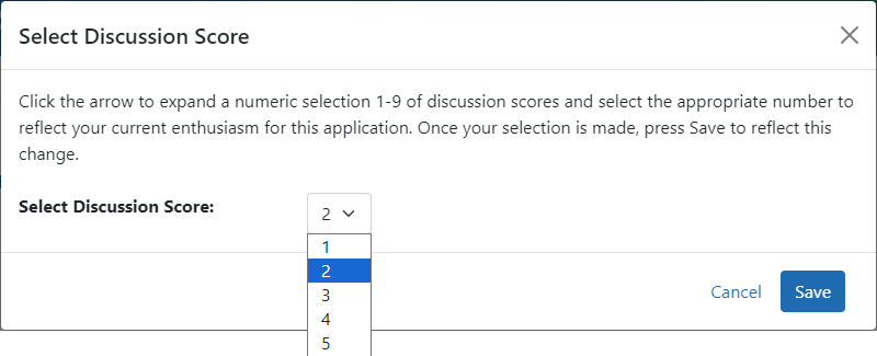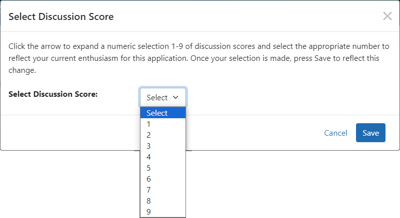 For Virtual Meetings, reviewers will provide discussion scores on the main Virtual Meeting Discussion Dashboard screen. These are numeric scores that the reviewers use to indicate current enthusiasm for the application. They are informative only and carry no weight in the final scoring. Reviewers may update their discussion score multiple times throughout the DISCUSSION phase.