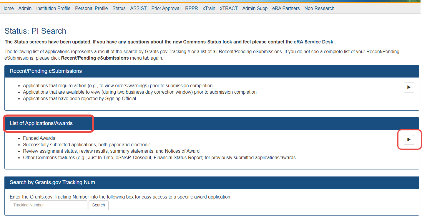 Under List of Applications/Awards, click the arrow button, outlined in red above.