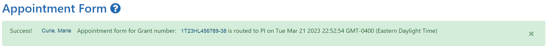 | 4. | Click the Save & Route to PI button. The system will validate the information contained in the form and will flag any errors or warnings found. Errors must be corrected before the Appointment is routed. Warnings are corrected at your discretion. A confirmation message is displayed at the top of the screen indicating that the Appointment Form has been successfully routed to the PI. The status of the appointment is changed to In-Progress PI. |