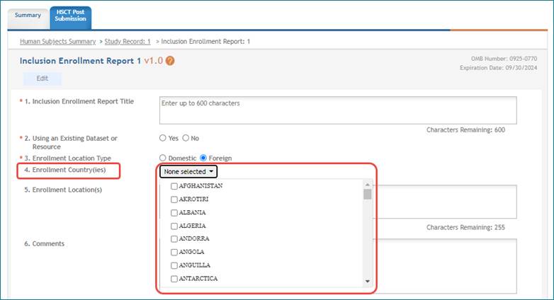 New country codes, detailed here, incorporated in country drop-down lists on the Inclusion Enrollment Report form; see Figure 2.