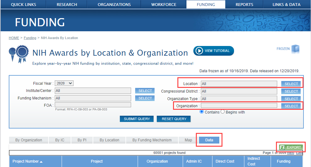 Figure 1: NIH Awards by Location & Organization search screen highlighting the relevant fields (click image to see full size)