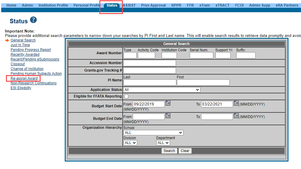 After verifying your award information, if a grant needs to be reassigned within an institution to ensure grant information accuracy, this can be done using eRA Commons’ Re-assign Award feature that is found on the left side of the Status search screen (See Figure 2). Reassignment can only be done by users with the signing official (SO) role within Commons.
